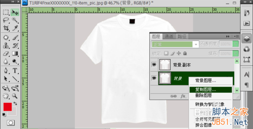 2、接下来我们就需要将“男T恤”的背景,复制一层出来,是“背景副本”。同样可以按住“Ctrl+J”的组合键来快速拷贝背景图层,这将是“图层1”。