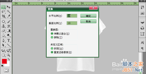 7、这一步我们就要执行“滤镜”—“扭曲”—“置换”命令,水平比例和垂直比例的数值不是固定的,这要看衣服的褶皱程度,如果横的褶皱多于竖的褶皱,那水平比例就要大于垂直比例,其次褶皱相反则数值比例也就相反。