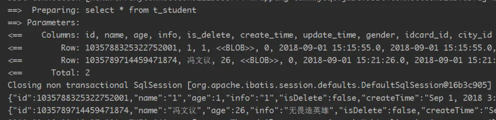 ==> Preparing: SELECT id,name,age,info,is_delete,create_time,update_time,gender,idcard_id,city_id FROM t_student WHERE name = ? AND age = ?