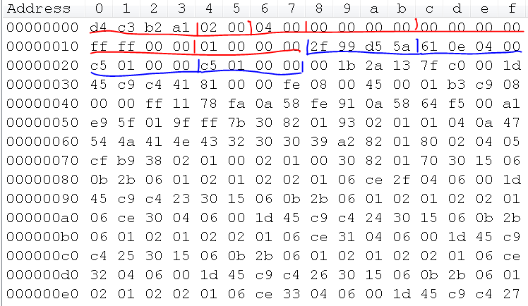 红色部分是Pcap Header,蓝色部分是Packet Header,当然这是从pcap文件的起始部分开始的。希望别嫌弃这扭曲的线条