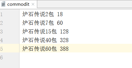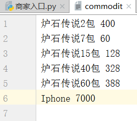 1、新建一个文件,名为 commodit 商品排列格式如下(自己可以更改商品名字或者价格)