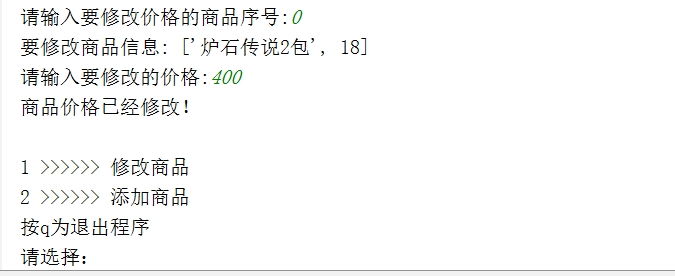 输入0,修改第一个商品价格为400: