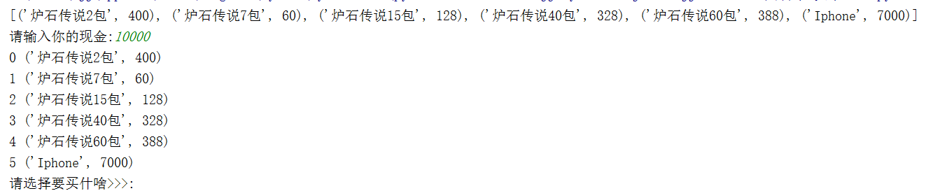 user_choice = input("请选择要买什啥>>>:")
