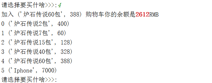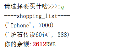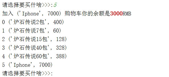 print("加入 %s 购物车你的余额是\033[31;1m%s\033[0mRMB" %(p_item,salary))