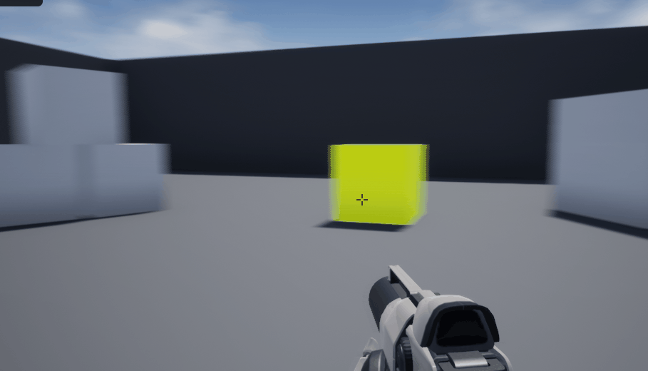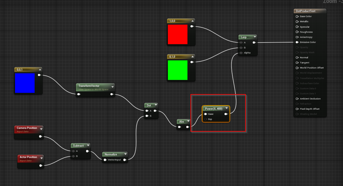 点积的应用:材质球的颜色会随着第一人称的视角变换而变换,当对准被赋予了该材质球的模型时,模型呈绿色,没有对准时是其他颜色,如下图GIF。