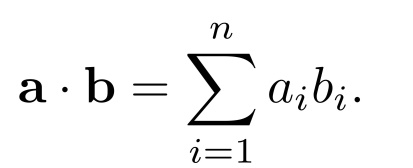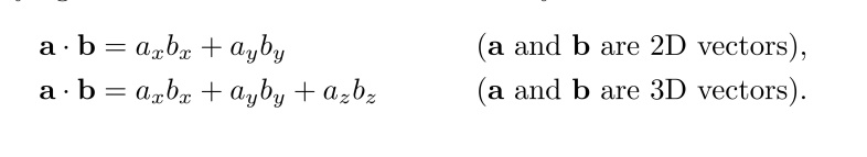 There are two types of vector products: Dot Product & Cross Product. Compared with cross product which is applied only in 3D, Dot product has more common and usable fields such as graphics, simulation or AI. and it undoubtedly has much more important relatinships to many other operations, such as matrix multiplication, convolution of signals, statistical correlations, Fourier transforms...... Of course, we will illustrate more details about these in the following chapters as well. Now let’s focus on the fundamental definition of dot prdocut and cross product.