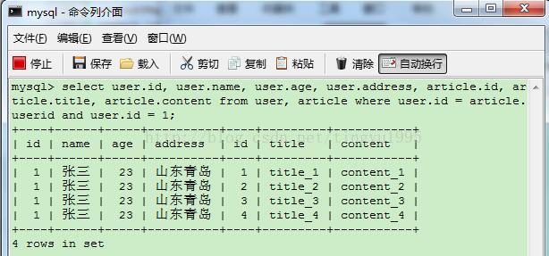 select user.id, user.name, user.age, user.address, article.id, article.title, article.content