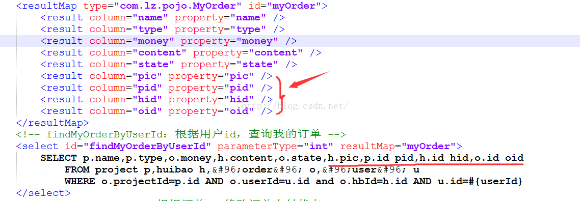 <select id="findMyOrderByUserId" parameterType="int" resultMap="myOrder">