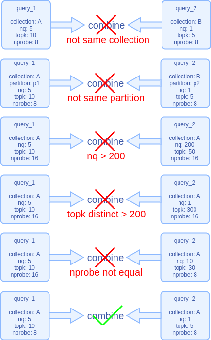 查询请求的合并允许多个合并,具体能够合并的请求数目由 Milvus 运行时的状态决定。多个查询合并需满足如下几个条件: