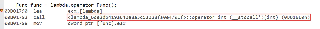以上结论的正确性可以通过显式调用 lambda 的转换函数与反汇编来证明