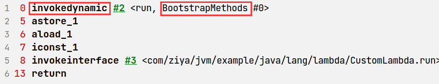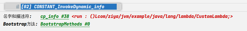 1、通过indy后面的操作数,拿到常量池中的信息:JVM_CONSTANT_InvokeDynamic。大家有没有注意到,我们Java代码中的run方法返回类型是void,编译之后却是CustomLambda。言外之意,这一步执行完会创建CustomLambda的实现类对象。