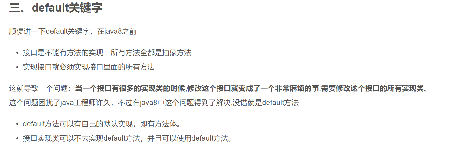關於default關鍵字,以前也介紹過,這是對接口的一種"寬容";具體可參考Java多态八:接口中的默认方法;接口中的静态方法;接口应用中的常见问题;文末comments:静态方法和静态属性在继承中的性质這篇文章。