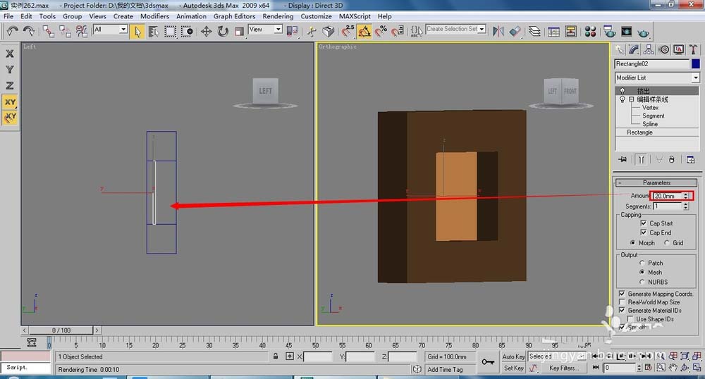 2、将制作的方块在原位置复制一个,进入(样条线)层级,删除外面的样条线,修改挤出数量为20,调整至透空方块向内的位置,如下图所示。
