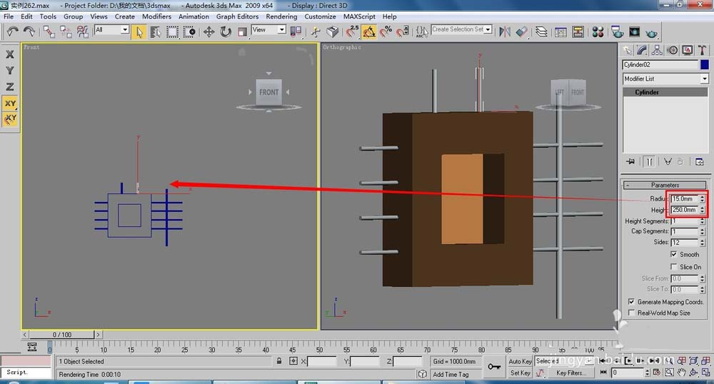 3、在视图中围绕方块创建圆柱体,具体的位置和参数如下图所示。