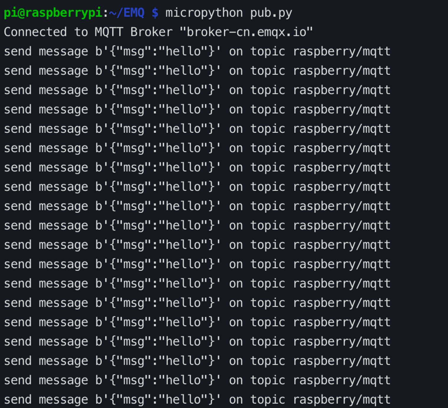 以上就是在树莓派上使用 MicroPython 进行编程的简单示例。我们通过 MicroPython umqtt.simple 实现了一个简单的测试客户端,并完成了该客户端与 MQTT 服务器的连接与消息收发。 MQTT 最大优点在于以极少的代码和有限的带宽,为连接远程设备提供实时可靠的消息服务,而树莓派则是一个体积小、发热低、能耗低、相对全面的硬件模块。二者相结合,即使是在微控制器或是受限环境中,也可助您开发出更多创新应用。
