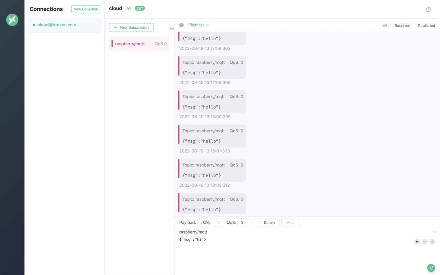 - 使用 MQTT X 客户端与 MQTT 服务器建立连接,并向主题 raspberry/mqtt 发送消息 。
