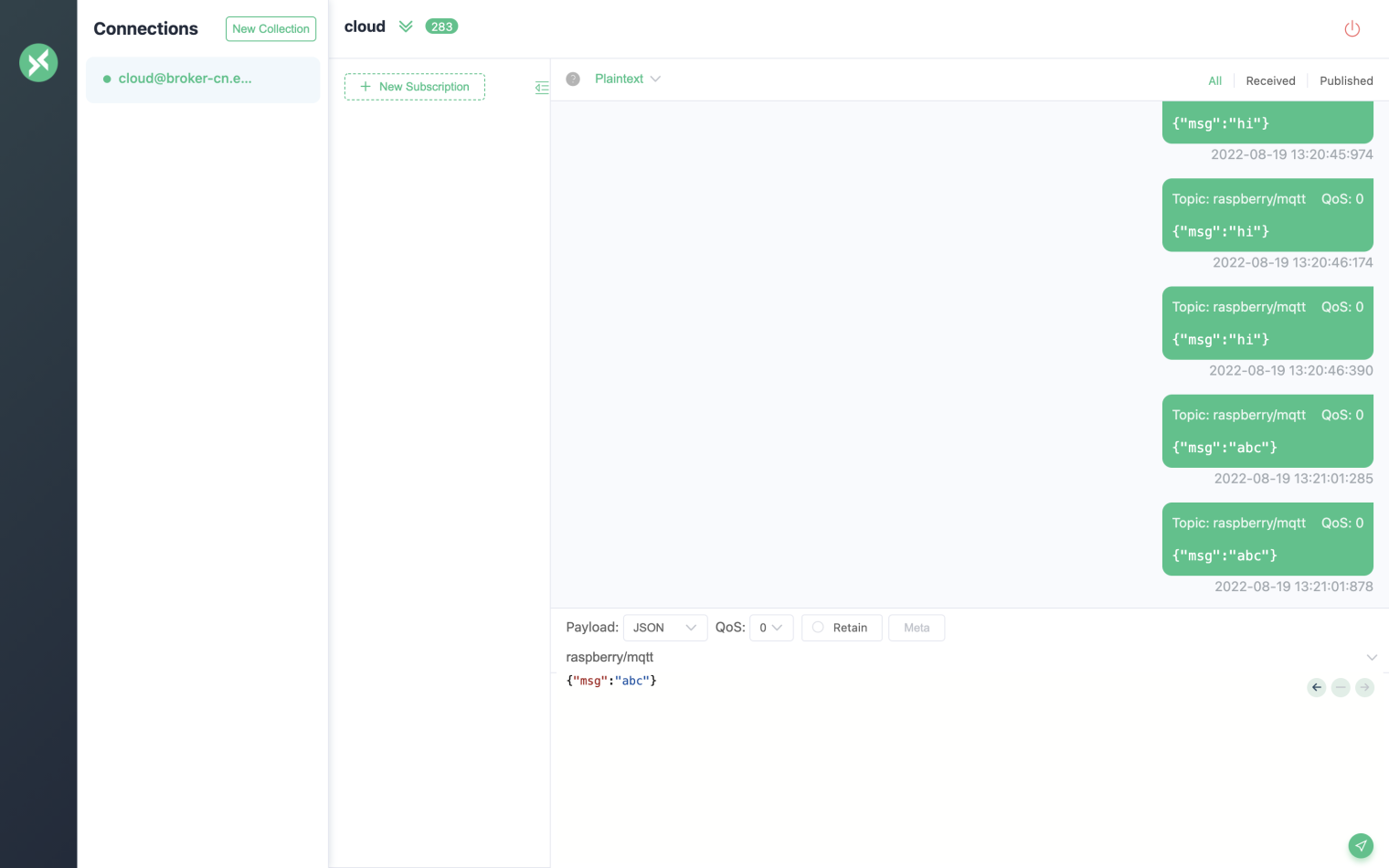 3. 在 MQTT X 客户端中,查看树莓派发送的消息。