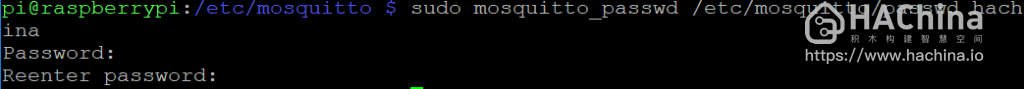 /etc/mosquitto/passwd,并增加用户hachina,设置密码sudo mosquitto_passwd -c /etc/mosquitto/passwd hachina