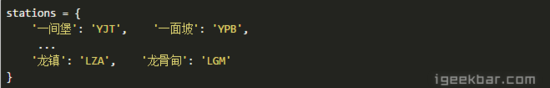 我们运行这个脚本,它将以字典的形式返回所有车站和它的大写字母代号, 我们将结果重定向到stations.py中,