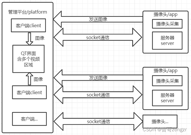 管理平台主要利用QT库实现UI界面的显示,目前在界面上创建了4个图像区域,每个区域相互独立,单独显示各自连接的摄像头的图像画面,支持连接多个摄像头服务器,每连接一个摄像头均会在对应区域将该摄像头的图像画面显示出来,每个连接都会打开一个socket套接字进行连接,保持一条TCP通信链接进行数据收发。管理平台在TCP连接中作为客户端,主动去连接服务器(摄像头端)。