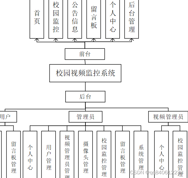 此校园视频监控系统分为管理员操作,用户操作和视频管理员操作。用户的操作主要是可以在网页上浏览到首页,校园监控,公告信息,留言板,个人中心,后台管理等信息。管理员的操作,管理员登录后台进行操作,后台管理主要是针对一些校园视频监控信息的添加,更新校园视频监控信息管理,给管理员权限对用户和视频管理员进行修改等。