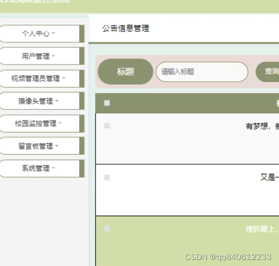 该部分内容包含了个人中心,用户管理,视频管理员管理,摄像头管理,校园监控管理,留言板管理,系统管理等功能。