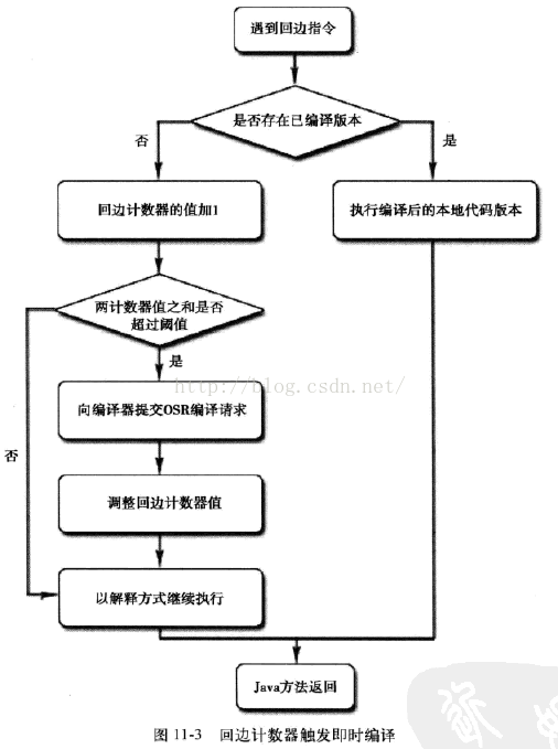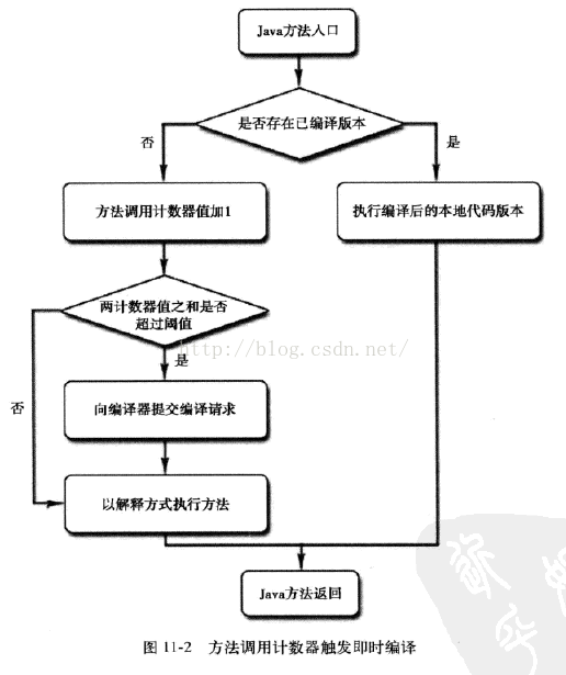 如果不做任何设置,执行引擎并不会同步等待编译请求完成,而是继续进行解释器按照解释方式执行字节码,直到提交的请求被编译器编译完成。当编译工作完成之后,这个方法的调用入口地址就会系统自动改写成新的,下一次调用该方法时就会使用已编译的版本。