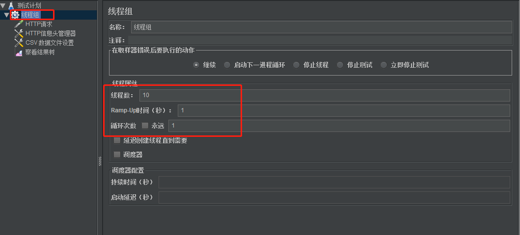 1)首先创建一个线程组:一共有10个线程,执行1次。
