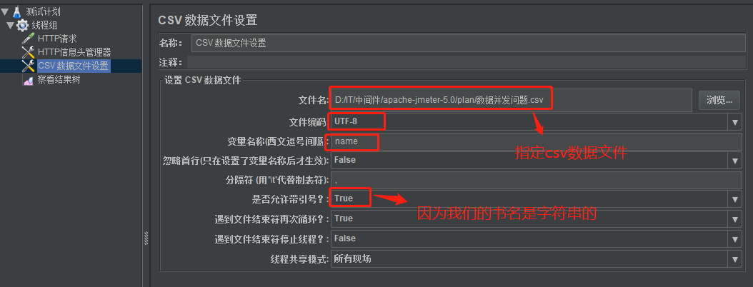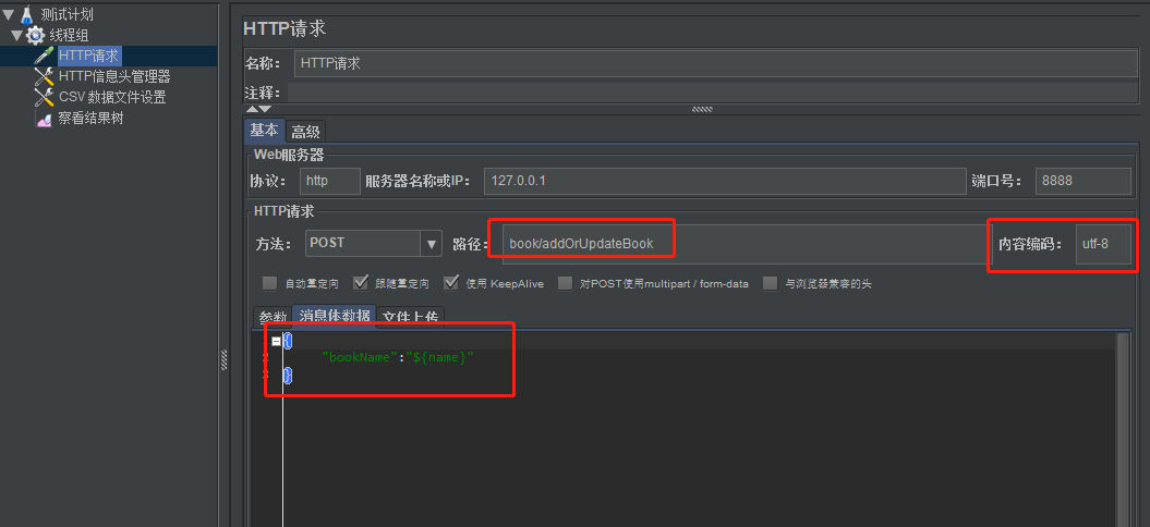 2)创建Http请求:消息体中的数据是循环读取CSV数据文件里的数据的