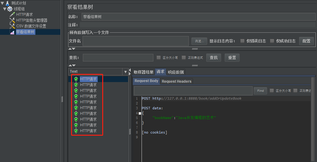 观察结果树:可以发现所有的请求都是请求成功的,没有报错。