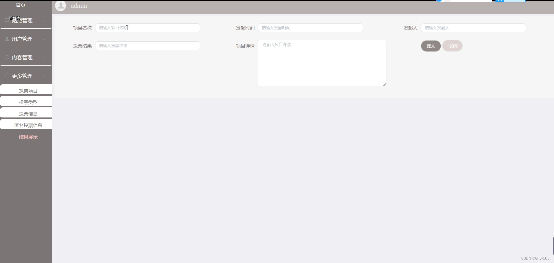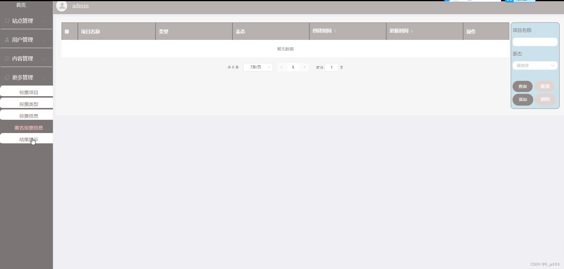 管理员发布新的结果信息,系统显示结果展示信息,结果展示信息添加功能主要指对其项目名称、发起时间、发起人、投票结果、项目详情等一些基本信息的添加、删除和修改。结果展示能根据多种条件对结果展示信息进行查询。