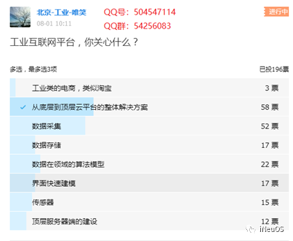 本篇文章是对以前点点滴滴的记录整理而成,也是我们做iNeuOS工业互联网操作系统进行的深入思考。本篇文章有宣传产品之嫌,但是确实是我们理念与实践相结合的产物。下面的图是我2017年参加完工博会后,在QQ群里做的调查,仅供大家参考。如下图: