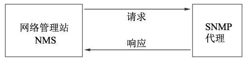SNMP 采用特殊的客户机/服务器模式进行通信。这里的客户端指的是网络管理站 NMS,服务器指的是 SNMP 代理。实际上它们的通信方式是网络管理站 NMS 与 SNMP 代理之间的通信,如图所示。