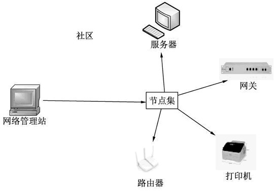 SNMP 的架构由 3 部分组成,分别为社区、网络管理站和节点,如图所示。