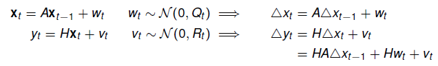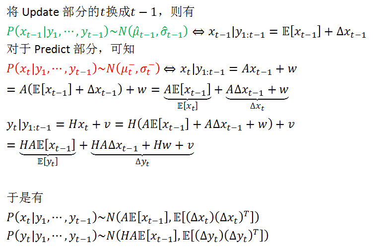 然后试着将Δxt和Δyt以Δxt-1的形式来给出,并且处于方便的考虑。我们忽略掉公式(1)中的控制项 B 和 C。于是有