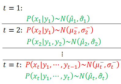 也就是说当t = 1时。我们依据观測值y1去预计真实状态x1,这个过程服从一个高斯分布。
