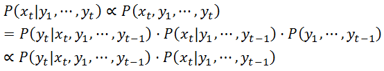 依据马尔科夫链的无记忆性,可知P( yt | xt, y1, … , yt-1) = P( yt | xt) 。