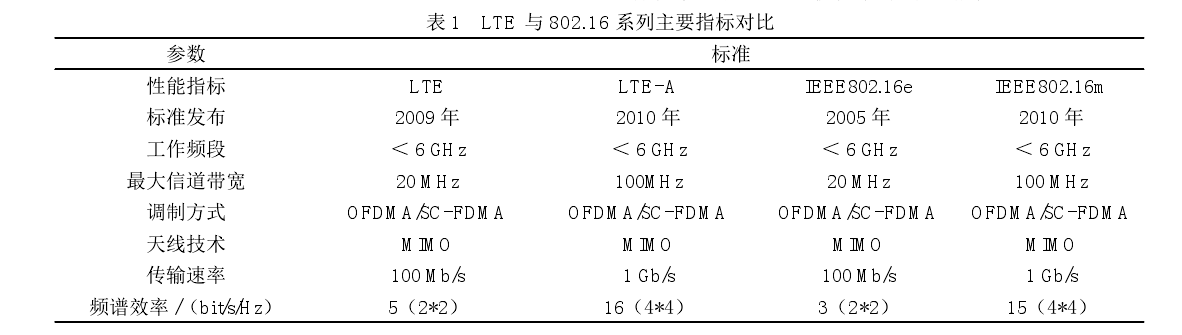 对目前 LTE 长期演进计划和 IEEE 802.16 系列两个主流宽带标准主要指标进行对比,结果如表 1所示。可以看出,两个标准系列采用的核心技术一致,均为 MIMO+OFDM 技术体制,信道带宽最大20 MHz 或 100 MHz,而两者的结合可以有效提高频谱效率、吞吐量和抗多径衰落的能力。