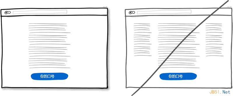 多次重复主旨口号这种方法适用于界面很长或者分页的情况。首先你肯定不想满屏刷出相同的信息,这样会让人生厌。但当页面足够长的时候这些重复就显示自然多了并且也不显得拥挤。所在在页面顶部放一个按钮然后在页面底部再适当放个突出的按钮的做法没有什么不妥。这样当用户到达页面底部在思考接下来该做什么的时候,你提供的按钮就可以获得一个潜在的合同或者即使用户不需要你的服务这个按钮也可以起到过滤的作用。