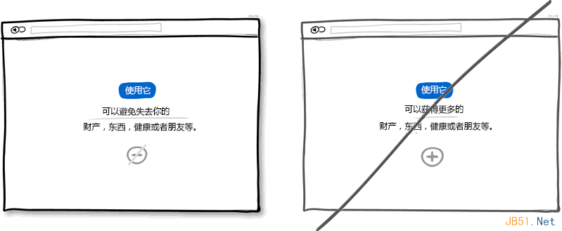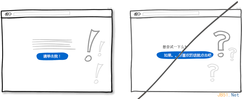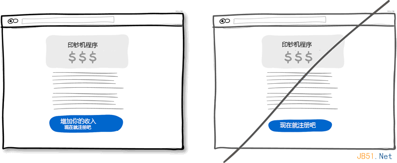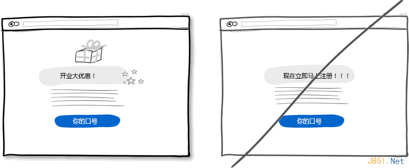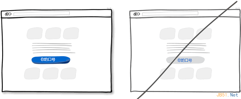 试想界面上有这样两个按钮:一个是"获取折扣",另一个是"立即注册"。我敢打赌大多数人会点击第一个,因为第二个按扭让人感觉不到有利可图,并且"注册"让人联想到填不完的表单。也就是说让用户感受到获利的按钮更有可能被点击。这种让用户感到好处的文字信息也可是放在按钮旁边,不一定要做为按钮的标题。当然,正常的按钮还是有用处的,一般用于重复性操作频繁的地方。