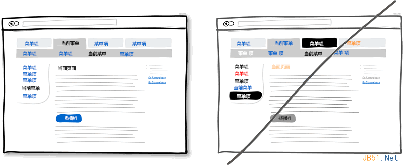 诸如颜色,层次及模块间的对比这些视觉上的设计可以很好地帮助用户使用产品:他时刻知道当前所处的页面以及可以转到哪些页面。要传达这样一个好的界面,你就需要将可点击的元素(比如连接,按钮),可选择的元素(比如单选多选框)以及普通的文字明显区分开来。在下图的例子中,我将点击操作的元素设置为蓝色,选中的当前元素为黑色。这样适当的设计可以让用户很方面地在产品的各模块间切换。但千万不要把这三种元素设计得混乱不堪。