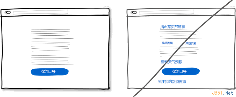 为了满足各式用户的需求,在页面上放些链接链到这里链到那里是常见的做法。如果你的主要目的是想让用户点击页面最后那个下载按扭什么的话,就需要三思了。因为用户可能点击了其他链接离开页面了。所以你需要注意页面的链接数量,最好将用于导航与用于操作的链接用样式区分开。尽量移除页面不需要的链接会让用户点击到你的功能按钮。