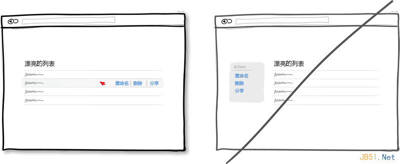 不用说直接在元素身上进行操作是更直观明了的方式。比如在一个列表中,我们想让用户对每个条目进行操作那么就把按钮放到当前条目上,而不要把放到列表之外。再比如就是直接点击元素就进入编辑状态(比如页面上的地址信息点击后可以进行编辑)。这种方式比传统的选中再点击相应的按钮进行操作要简洁省事得多。当然,对于一般性的操作本身就不需要有什么上下文的,就没必要这么做了,比如页面上的前进,后退按扭。