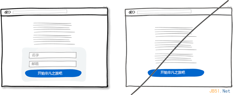 在一个足够大的宽屏界面上最好还是直接给出表单,这比点击按钮再弹出表单要好很多。首先减少了点击操作,流程变得简洁也节省了时间。其次,直接呈现出表单可以让用户知道表单有多长,其实也是在告诉用户注册花不了多少时间。当然,这条规则适合注册表单非常简单的情况。