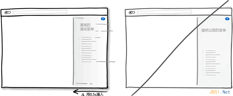 用户进行操作过程中,界面上的元素会经常出现,隐藏,打开,关闭,放大缩小移位等。给这些元素增加些自然的动画,淡入淡出效果不但美观,也更符合实际,本来元素尺寸位置的变化就是一个需要时间的动画过程。但要注意动画时间不要设置过长,那样会让想尽快完成操作的用户不耐烦。