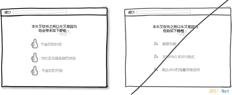 市场就是这样的,用户永远只关心自身利益而产品特性对他们来说倒不是那么重要。只有利益才更直观地体现出使用产品所带来的价值。Chris Guillebeau在他的著作《100美元起家》中指出,相比压力,冲突,烦心事和未知的未来,人们在乎得更多的是爱,金钱,认同感和自由支配的空闲时间。所以我相信在展示产品特性时回归到利益上是必要的。