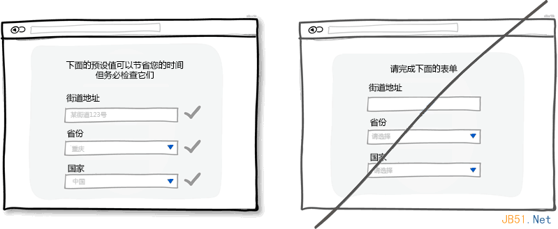 适当的默认值和预先填充好的表单字段可以大量减少用户的工作量。在节省用户宝贵的时间上面,这是种非常常见的做法,可以帮助用户快速填完表单或者注册信息。