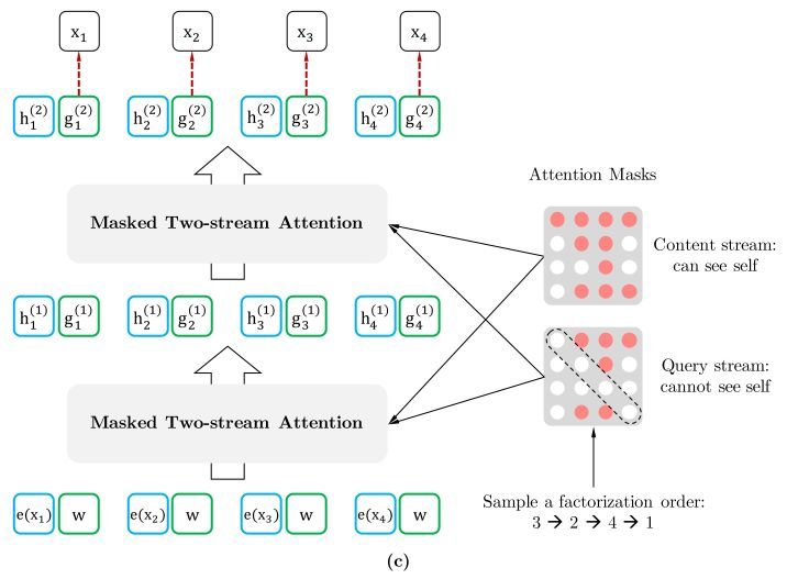 第二点,当然这是实现细节了,(b)图中为了便于说明,只将当前位置之外的 h 作为 K 和 V,但实际上实现中应该是所有时序上的 h 都作为 K 和 V,最后再交给 (c)图中的 Query stream 的 Attention Mask 来完成位置的遮盖。