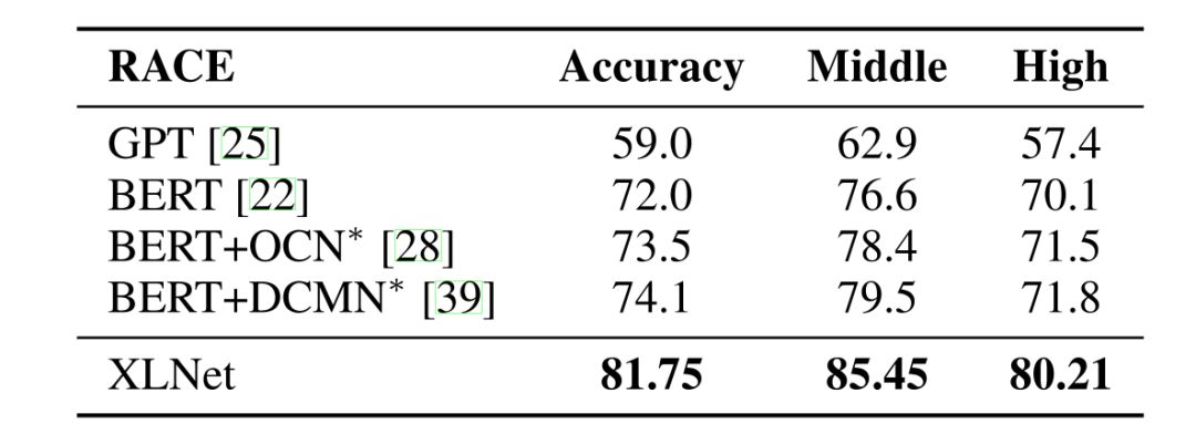 之后进入一个特殊关卡,ClueWeb09-B 文档排序数据集,主要用于测试模型生成的词向量效果。只见 XLNet 上拉,下落,一个完美的钟形机动,从上方绕了过去。这证明了光从模型获得基于语境的词向量,XLNet 也是要优于 BERT 的。