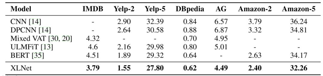 接下来,开始进入一系列文本分类障碍,它们有 IMDB, Yelp-2, Yelp-5, DBpedia, AG, Amazon-2, and Amazon-5。很多名字一看起来就像炮灰, XLNet 一系列动作下来,迅速越过,最后还轻松地做了一个殷麦曼(别问我这是什么,我也不懂)动作。可以看出 XLNet 在句子表征方面性能也很棒。
